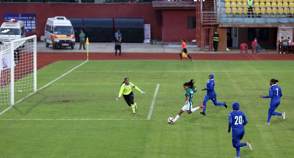काठमाडौँ । छैटौँ संस्करणको महिला साफ च्याम्पियनसिप फुटबलमा बङ्गलादेशले माल्दिभ्सलाई पराजित गर्दै विजयी हासिल गरेको छ ।