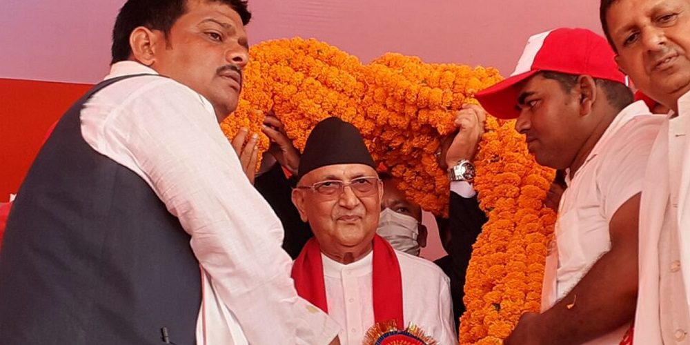 एमाले जिल्ला कमिटीले जनकपुरको तिरहुतिया गाछीमा आयोजना गरेको जनसभा तथा पार्टी प्रवेश कार्यक्रममा सहभागी हुन पुगेका ओलीलाई उक्त माला लगाइएको हो ।