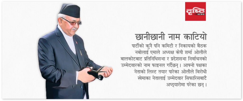 निर्वाचन आयोगले असोज २ र ३ गते समानुपातिक निर्वाचन प्रणालीअन्तर्गतको उम्मेदवारहरूको बन्दसूची पेश गर्ने समय तोकेको छ । त्यसका लागि पार्टीको कुनै पनि कमिटी र निकायको बैठक नबोलाई ओली निवास बालकोटमा महासचिव शंकर पोखरेल र उपमहासचिव विष्णु रिमालले ओलीले भनेका नामहरू टिपोट गरेका छन् । त्यसमा को-को परेका छन् भन्ने कुरा पार्टीभित्रै गोप्य राखिएको छ ।