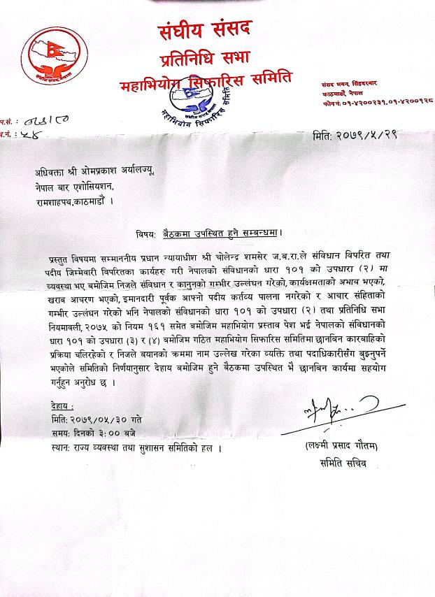 यसअघि अधिवक्ता अर्यालले भदौ २८ गते नै इमेलमार्फत् निवेदन पठाएर चोलेन्द्रले लगाएका आरोपका सम्बन्धमा जिरह गर्न पाउनुपर्ने माग गरेका थिए । त्यसपछि समितिले बुधबार अधिवक्ता ओमप्रकाश अर्याल लगायतका केही व्यक्तिहरुलाई पत्र काटेर बयानका लागि बोलाएको हो ।