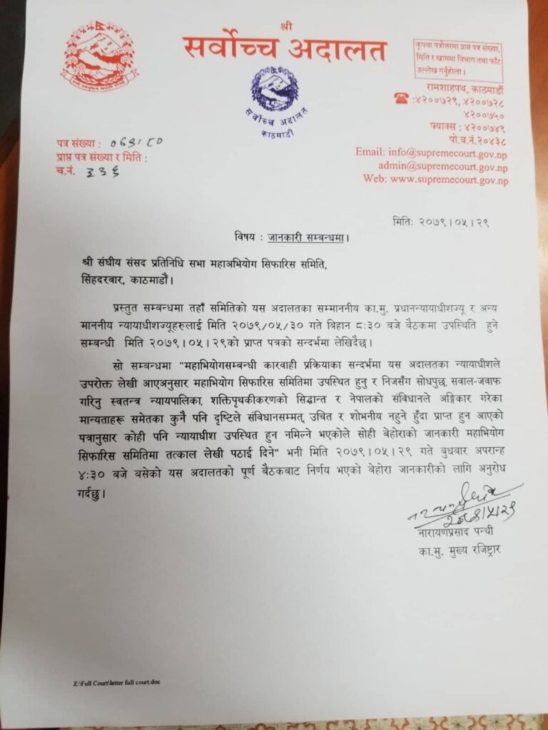 सर्वोच्च अदालतले पूर्ण बैठकको निर्णय प्रमाणीकरण गरेर बुधबार नै संघीय संसद सविचालयमा पत्र पठाइसकेको छ ।