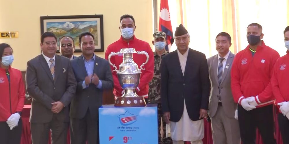 काठमाडौं । नवौं राष्ट्रिय खेलकुद प्रतियोगिताको ट्रफी सार्वजनिक गरिएको छ । राष्ट्रिय खेलकुद परिषद्(राखेप)ले शुक्रबार प्रधानमन्त्री निवास बालुवाटारमा आयोजना गरेको कार्यक्रममा प्रधानमन्त्री शेरबहादुर देउवाले नवौं राष्ट्रिय खेलकुद प्रतियोगिताको ट्रफी सार्वजनिक गरेको हो ।