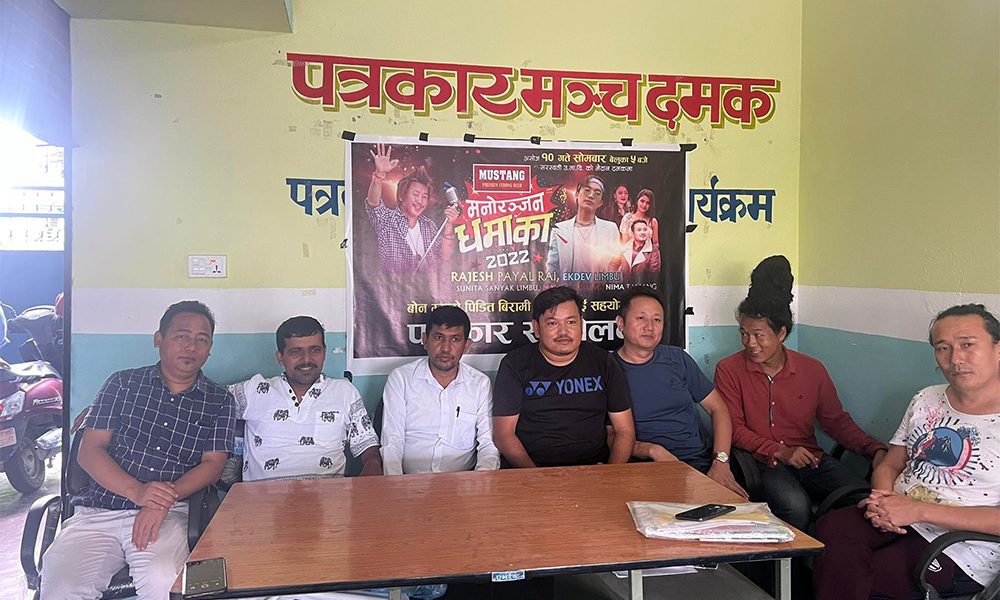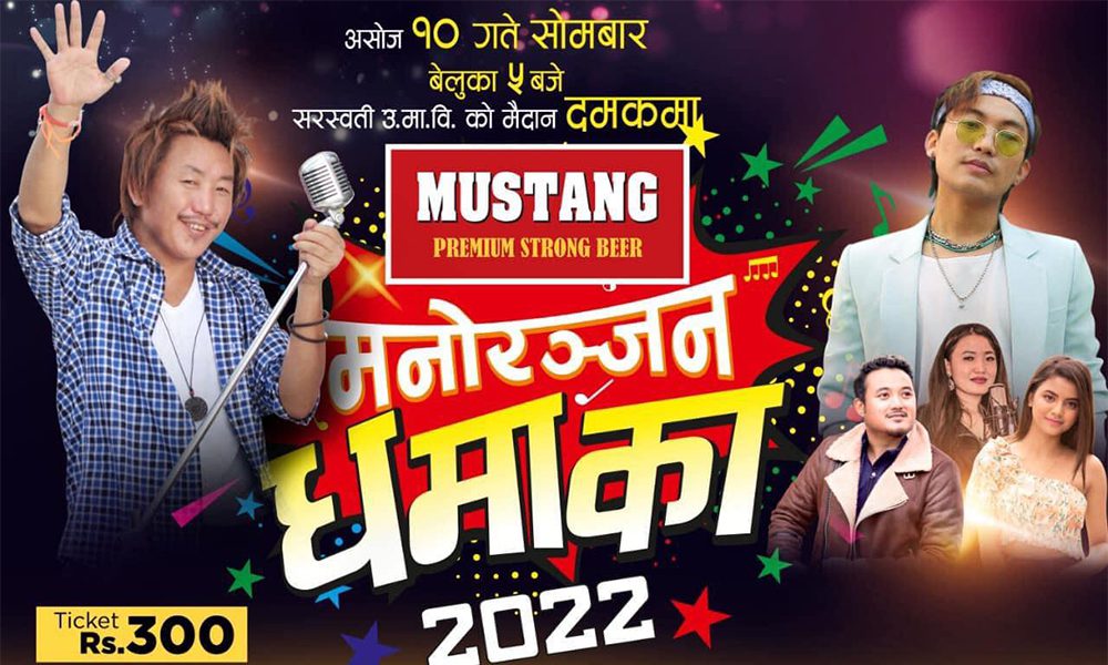 ‘मनोरञ्जन धमाका’ नामक कन्सर्ट असोज १० गते सोमबार साँझ ४ बजेदेखि ७ बजेसम्म सञ्चालन हुनेछ । कार्यक्रममा चर्चित गायक राजेशपायल राई र गायक एकदेव लिम्बूले प्रस्तुति दिने छन् ।