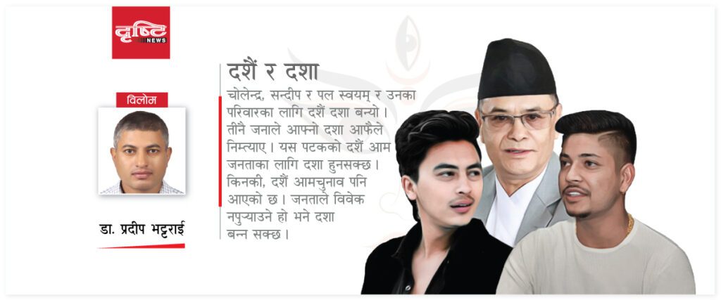 सनातनको कोणबाट यसरी दशैं नआउनेहरूको सन्दर्भ सामान्यीकरण होला । तर, केही कपुतहरूको दुर्बुद्धिका कारण उनीहरूलाई दशैं आउँदैन जो आफ्नै कुकर्मको परिणामले खुशी डाँडापारि नै राखेर बाँच्न अभिसप्त हुन्छन् । यस्ता मानिसको कोटीमा यस वर्ष दुई स्टार पल शाह र सन्दीप लामिछाने पनि परेका छन् । नावालिगमाथि कुकर्म गर्ने अपराधीका रूपमा कलाकार पल शाहको दशैं जेलको कोठरीमा बित्ने भएको छ । उनी अदालतबाट दोषी प्रमाणित भइसकेका छन् ।