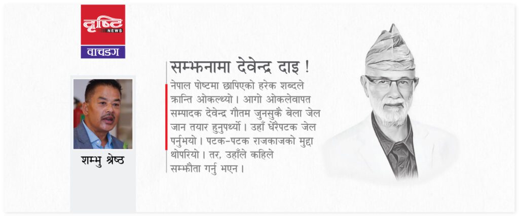 नेपाल पोष्टमा छापिएको हरेक शब्दले क्रान्ति ओकल्थ्यो । आगो ओकलेवापत सम्पादक देवेन्द्र गौतम जुनसुकै बेला जेल जान तयार हुनुपथ्र्यो । उहाँ धेरैपटक जेल पर्नुभयो । पटक–पटक राजकाजको मुद्दा थोपरियो । तर, उहाँले कहिले सम्झौता गर्नु भएन ।