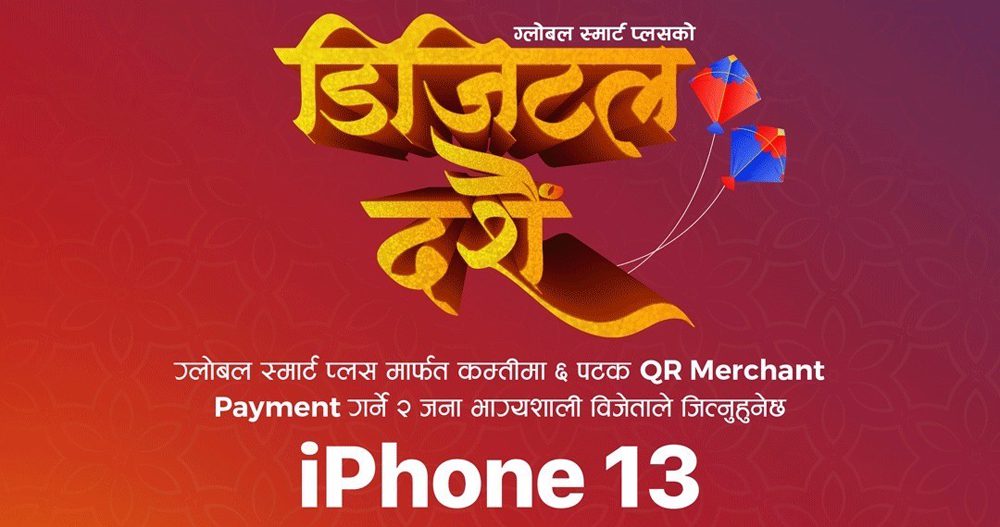 असोज १ देखि महिनाभर चल्ने यो अभियानअन्तर्गत ग्लोबल स्मार्ट प्लसबाट क्यूआरमार्फत कारोबार गरी सामान खरिद गर्दा यस अभियानको अन्त्यमा गोलाप्रथा मार्फत २ जना भाग्यशाली ग्राहकहरुलाई आइफोन १३ प्रदान गरिनेछ ।