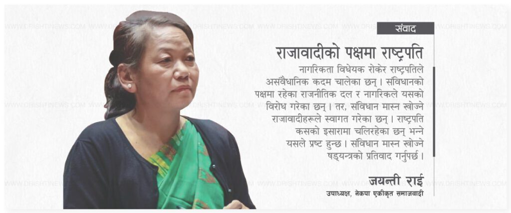नागरिकतासम्बन्धि विधेयकमा पनि त्यही भएको हो । नागरिकता विधेयकमा पक्कै पनि सबैको एकमत थिएन । मेरो पनि केही विषयमा फरक मत थियो । मैले पनि संशोधन हालेको थिएँ । तर, निर्णय त बहुमतको हुन्छ । बहुमतले गरेको निर्णयलाई नमान्ने कुरा अलोकतान्त्रिक हो । बहुमतको आधारमा दुई–दुई पटक पारित भएको विधेयक रोकेर राष्ट्रपतिले संविधान विपरीतको काम गर्नुभयो ।