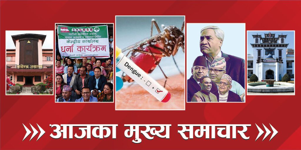 ६. नेपालमा डेंगु संक्रमणबाट एकैदिन चार जनाको मृत्यु, स्वास्थ्य तथा जनसंख्या मन्त्रालयका अनुसार साउनयता डेंगुबाट ३६ जनाको मृत्यु, २७ हजार ५६९ जनामा संक्रमण, सबैभन्दा बढी काठमाडौं उपत्यकाका डेंगुका बिरामी, बागमती प्रदेशमा २१ हजार ५८९, लुम्बिनीमा प्रदेशमा ३ हजार ५०, सुदूरपश्चिम प्रदेशमा ८२१, गण्डकीमा ६ सय ५३, मधेश प्रदेशमा ४०५ र कर्णाली प्रदेशमा २३६ जनामा संक्रमण ।