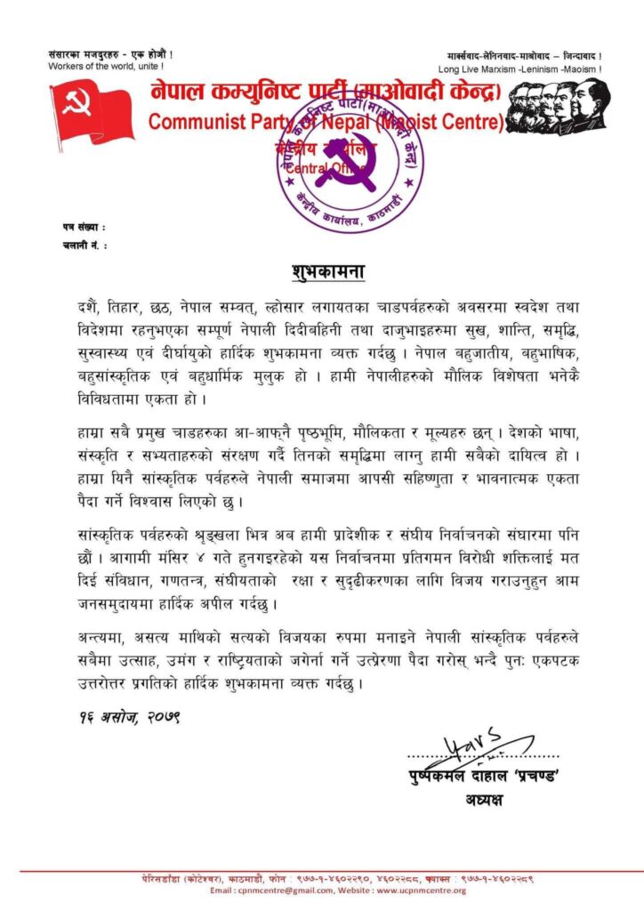 दशैं लगायतका चाडपर्वहरूको अवसरमा एक शुभकामना सन्देश जारी गर्दै अध्यक्ष प्रचण्डले ‘नेपाल बहुजातीय, बहुभाषिक, बहुसांस्कृतिक एवं बहुधार्मिक मुलुक भएको बताएका छन्।