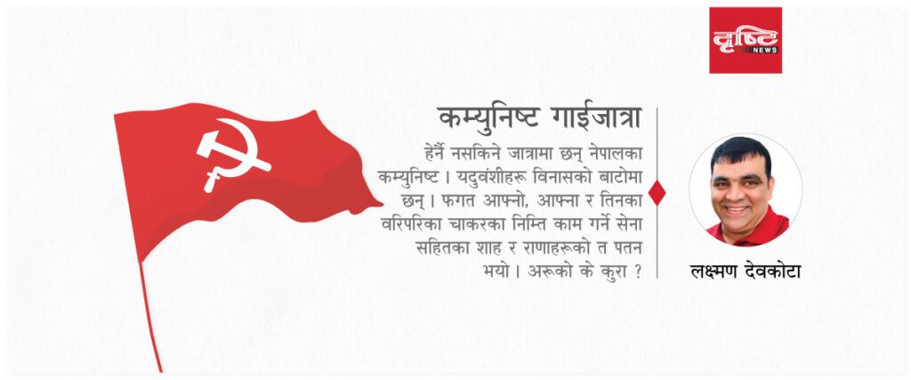 र पनि हेर्नै नसकिने जात्रामा छन् नेपालका कम्युनिष्टहरू । यदुवंशीहरू विनासको बाटोमा छन् । फगत आफ्नो, आफ्ना र तिनका वरिपरिका चाकरका निम्ति काम गर्ने सेना सहितका शाह र राणाहरूको त पतन भयो । अरूको के कुरा ? विद्रोह जरैबाट शुरू भएको छ, नसुध्रिए ढिलो चांडो समाप्ति नै हुने हो । समाप्त हुने कि सुध्रने सबै आफ्नै हातमा छ ।