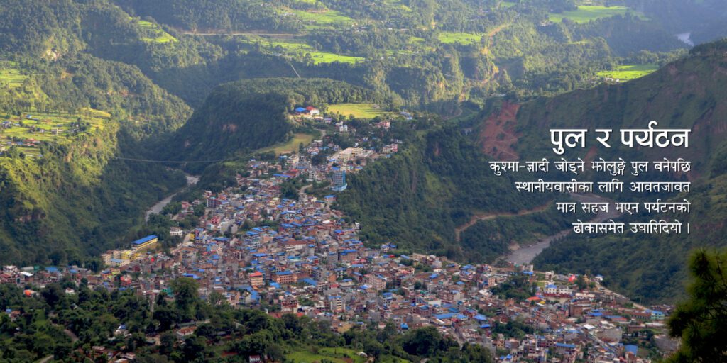 कुश्मा । अब सदरमुकाम कुश्मा आइपुग्न पहिले जस्तो घण्टौँ लाग्दैन । कुश्मा–ज्ञादी झोलुङ्गे पुल बनेपछि दक्षिण भेगका स्थानीयवासीका लागि कुश्मा बजार सहज बनेको छ ।