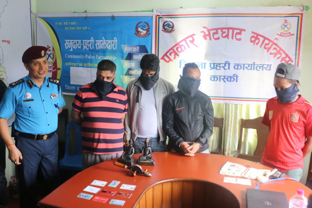 सुनको भन्दै अन्य धातुबाट निर्मित बुद्ध मूर्ति बेच्ने र सुनका गहना चोर्नेलाई पोखरामा पत्रकार सम्मेलनमार्पmत सार्वजनिक गर्दै कास्की प्रहरी ।