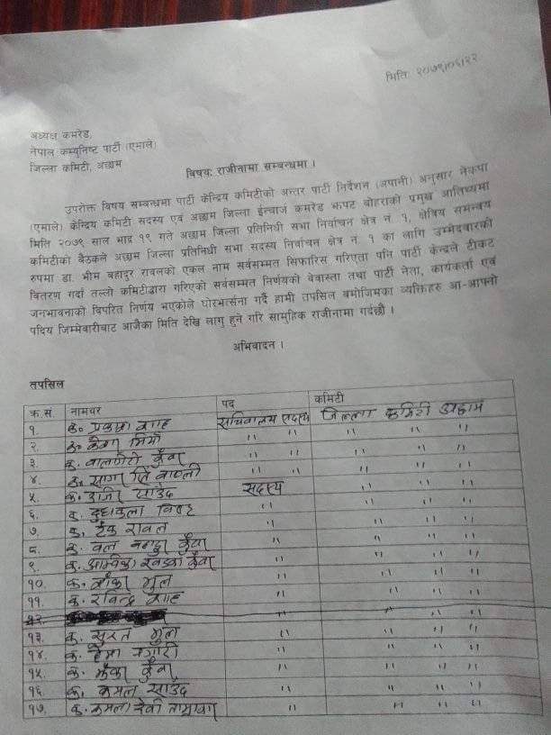 अछाम जिल्ला कमिटीलाई दिएको राजीनामा पत्रमा उनीहरुले जिल्ला इन्चार्ज झपट बोहराकै प्रमुख आतिथ्यतामा भएको बैठकले सर्वसम्मत रुपमा रावलको एकल नाम सिफारिस गरे पनि केन्द्रले नमानेपछि विद्रोह गर्नुपरेको उल्लेख छ ।