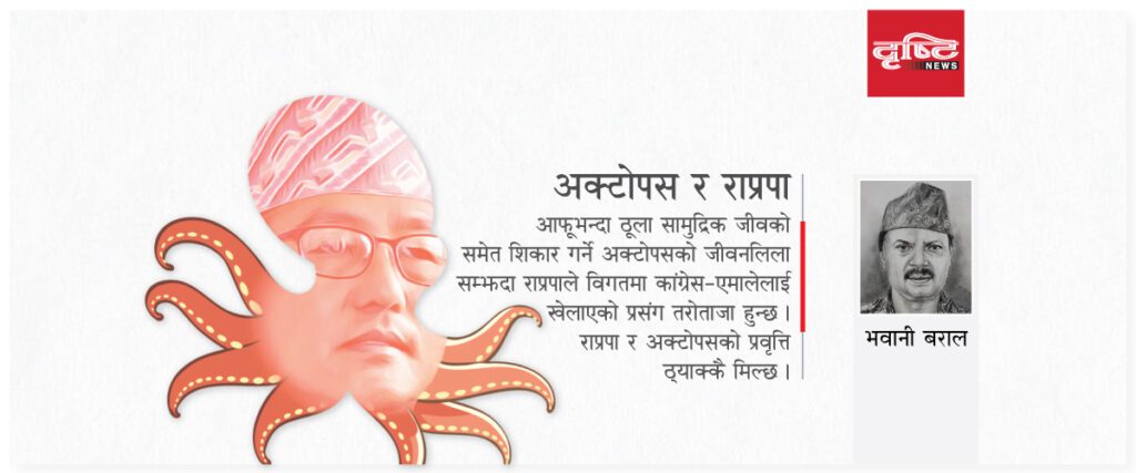 आफूभन्दा ठूला सामुद्रिक जीवको समेत शिकार गर्ने अक्टोपसको जीवनलिला सम्झदा राप्रपाले विगतमा कांग्रेस–एमालेलाई खेलाएको प्रसंग तरोताजा हुन्छ । राप्रपा र अक्टोपसको प्रवृत्ति ठ्याक्कै मिल्छ ।