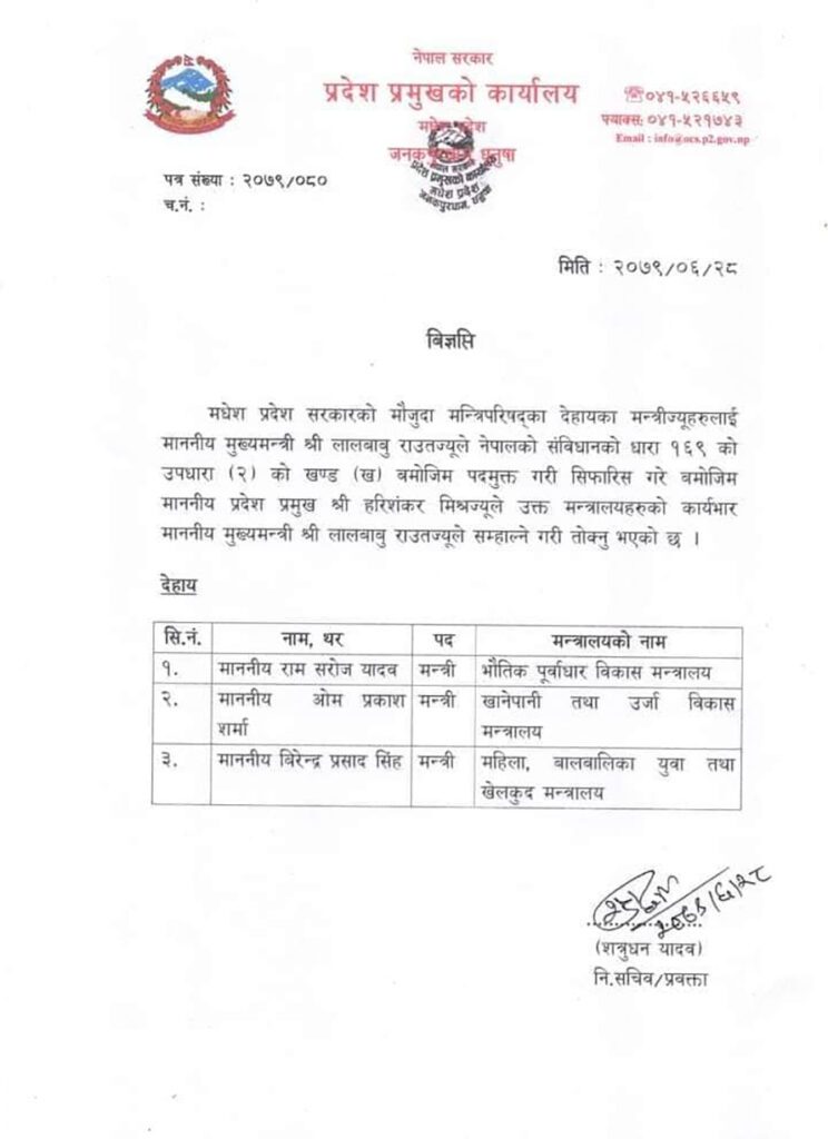 जनकपुरधाम । मधेश प्रदेशका मुख्यमन्त्री लालबाबु राउतले नेपाली कांग्रेसबाट सरकारमा सहभागी तीन जना मन्त्रीलाई बर्खास्त गरेका छन् ।