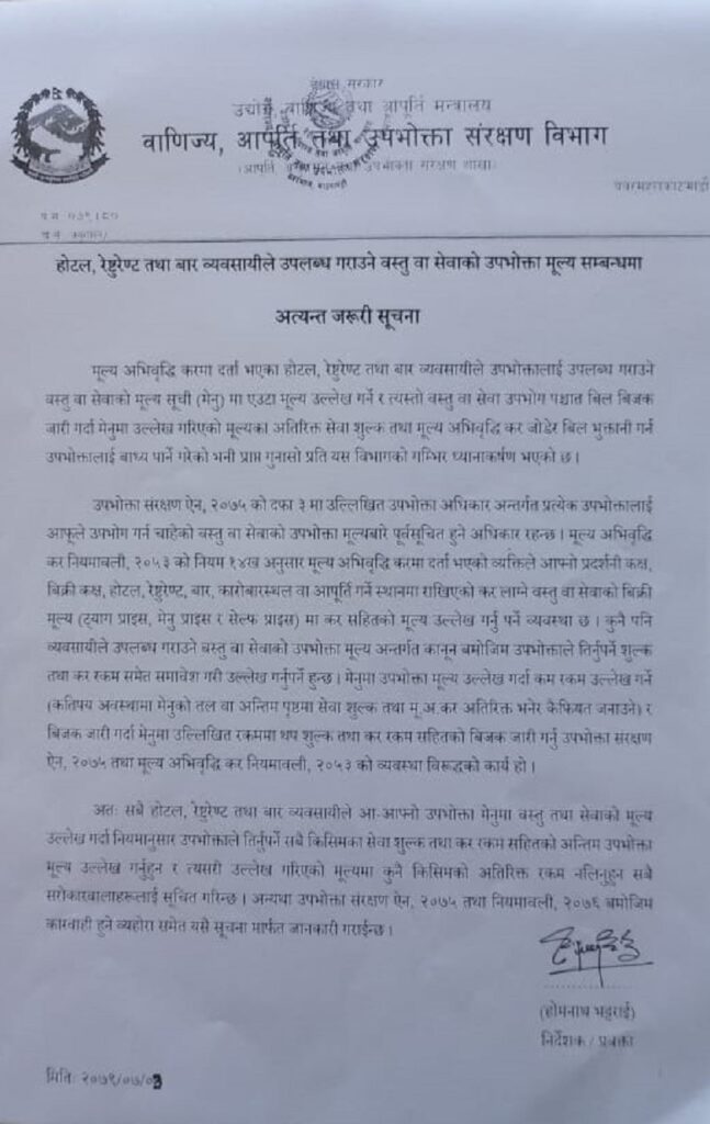 मेन्यूमा नियमानुसार उपभोक्ताले तिर्नुपर्ने सबै किसिमका सेवा शुल्क तथा कर रकम सहितको मूल्य राख्न निर्देशन दिएको हो । विभागका निर्देशक होमनाथ भट्टराईले एक विज्ञप्ति जारी गर्दै होटल, रेष्टुरेण्ट तथा बार व्यवसायीलाई मेन्युमा राखेको मूल्य नै अन्तिम मूल्य भएको स्मरण गराउँदै सोही बराबरको रकम लिन निर्देशन दिएका हुन् ।