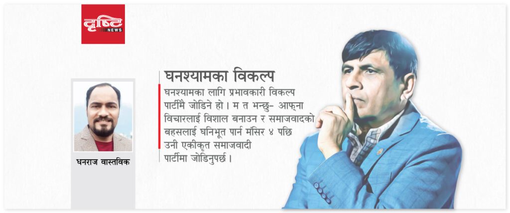 मेरो बुझाइ छ कि, नेपालमा समाजवाद स्थापना हुन्छ । त्यसका लागि बलियो राजनीतिक शक्ति चाहिन्छ । जो नेपालमा छैन । गफगाफकै क्रममा घनश्याम एमालेमै बस्नुको कारण जान्न मन लाग्यो । मैले वैचारिकरुपमै भने कि तपाईं एमालेमा रहनु र नरहनु, बस्नु र नबस्नुको के अर्थ छ ?