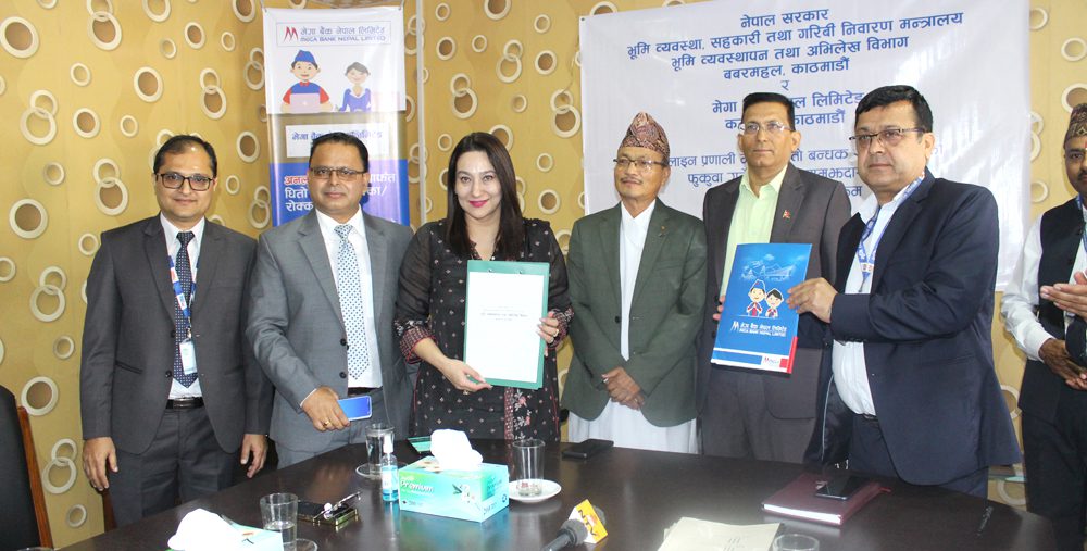 भूमि व्यवस्थापन तथा अभिलेख विभागमा आयोजित समारोहमा भूमि ब्यवस्था, सहकारी तथा गरिबी निवारण मन्त्रालयका सचिव रामप्रसाद थपलिया तथा मेगा बैंकका अध्यक्ष भोजबहादुर शाहको उपस्थितिमा अनलाइन प्रणालीमार्फत धितो बन्धक रोक्का, रोक्का फुकुवा गर्ने सम्बन्धमा समझदारी पत्रमा हस्ताक्षर भएको छ । समझदारीपत्रमा मेगा बैंकका तर्फबाट कामु प्रमुख कार्यकारी अधिकृत रविना देशराज श्रेष्ठ तथा भूमि व्यवस्थापन तथा अभिलेख विभागका तर्फबाट महानिर्देशक पिताम्बर घिमिरेले हस्ताक्षर गरेका हुन् ।