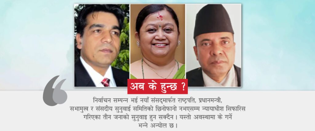 निर्वाचन सम्पन्न भई नयाँ संसद्मार्फत राष्ट्रपति, प्रधानमन्त्री, सभामुख र संसदीय सुनुवाई समितिको छिनोफानो नभएसम्म तीन जना न्यायाधीशको सुनुवाइ अड्किने अवस्था उत्पन्न भएको छ ।