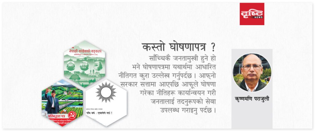 कुनै कामै गर्न नसकिने हो भने घोषणापत्रमा उल्लेख गर्नुको के औचित्य भयो र ? यसतर्फ दलहरूको ध्यान गएको देखिँदैन ।