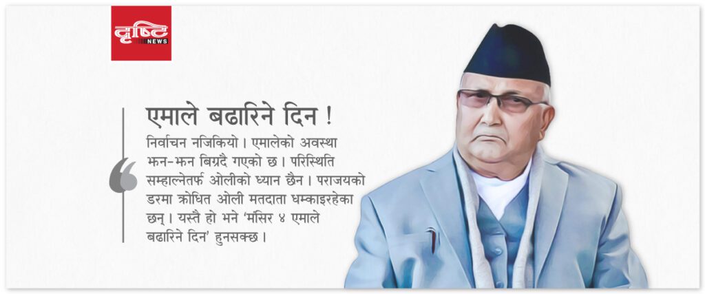 ओली मतदातालाई धम्की दिन्छन्– ‘निर्वाचनपछि एमालेको सरकार नबने देश झन् बर्बादीतर्फ जान्छ ।’