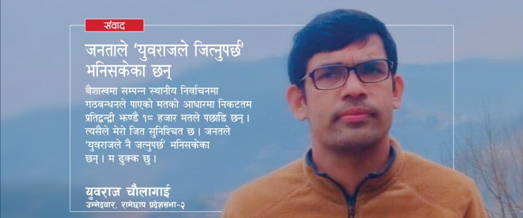 यो कुराको निर्णय गर्ने अधिकार हो । मलाई लाग्छ उहाँहरुले मलाई नै मत दिनुहुन्छ । किनभने रामेछापको माटो, यहाँको आवश्यकता, यहाँको स्थिती मैले राम्रोसँग बुझेको छ । रामेछाप र देशकै परिवर्तनका लागि बीसौं वर्षदेखि म राजनीतिक अभियानमा सहभागी छु । पार्टीको केन्द्रीय नेतृत्वको तहमा छु । पढेको छु, देश–विदेशबाट अनुभवहरु लिएको छु, युवा हुँ, काम गर्ने जोश र जाँगर छ, लामो समय काम गर्न सक्ने उमेर अवस्था छ । पार्टीको उच्च राजनीतिक नेतृत्वसँग सिधा पहुँच र सम्पर्क, सहकार्य गर्न सक्छु । यसले गर्दा पनि जनताले मबाट निकै अपेक्षा गर्नुभएको छ र म त्यसलाई पूरा गर्न तत्पर पनि छु । मेरो प्रतिष्पर्धी भन्दा म राजनीतिक र अन्य विषयहरुले पनि एउटा अब्बल उम्मेदवार हुँ । त्यस्तै हाम्रो गठबन्धनका दलहरुको पनि साथ र सहयोग मिलेको छ । संविधानको रक्षा, स्थायित्व र देशलाई समृद्धितर्फ लैजान हामीले प्रयत्न गरेका छौं । यो कुरा जनताको हितमा छ । उहाँहरुले यो कुरा बुझ्नु भएको छ । ६ महिना अगाडि सम्पन्न स्थानीय निर्वाचनको तथ्यांक हेर्ने हो भने हाम्रा निकटतम प्रतिद्वन्द्वी झण्डै १८ हजार मतले पछाडि हुनुहुन्थ्यो । त्यसैले यस पटक जित्ने उम्मेदवार युवराज चौलागाई नै हो । म त्यसमा विश्वस्त छु । मलाई माओवादी केन्द्र, नेपाली कांग्रेसलगायत नेकपा एमालेका केही असन्तुष्ट पक्षहरुले पनि मत दिने प्रतिवद्धता व्यक्त गर्नुभएको छ ।