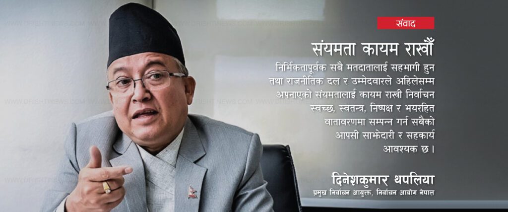 निर्वाचनको सञ्चालन, रेखदेख, नियन्त्रण र निर्देशनको संवैधानिक जिम्मेवारी बोकेको निर्वाचन आयोगका प्रमुख निर्वाचन आयुक्त दिनेशकुमार थपलिया निर्वाचनको निष्ठा जोगाउन पद, पैसा र प्रलोभनबाट नभई सिद्धान्त, विचार र नीति कार्यक्रमका आधारमा दल र उम्मेदवारले जित्नुपर्छ भन्नेमा दृढ छन् ।