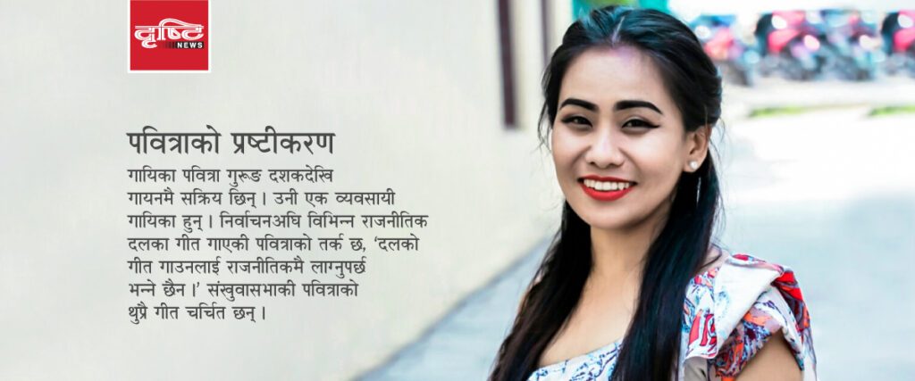गायिका पवित्रा गुरुङले यस पटक दर्जनभन्दा बढी चुनावी गीत गाइन् । त्यसो त यसपल्ट निर्वाचनमा थुप्रै कलाकारले उम्मेदवारी दिएका थिए । तर, जित हासिल गर्न असफल भए । गायिका गुरुङ भने चुनावी गीत गाएरै मालामाल भइन् । पवित्राले यस निर्वाचनमा राप्रपादेखि सत्ता गठबन्धनको चुनावी प्रचारका गीत गाइन् ।