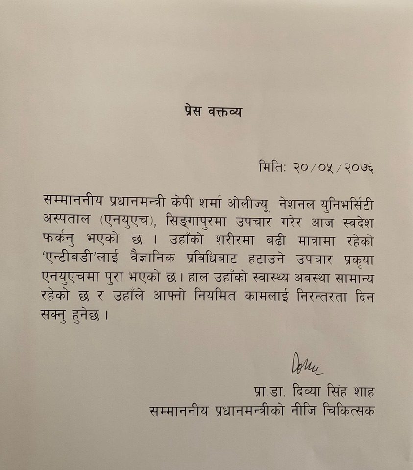 प्रधानमन्त्री केपी शर्मा ओलीले आफ्ना नियमित कामलाई निरन्तरता दिन सक्ने उनका निजी चिकित्सकले बताएका छन्। भदौ ५ गते उपचार गराउन सिंगापुर गएका प्रधानमन्त्री ओली आज स्वदेश फर्किए लगत्तै निजी चिकित्सक डा. दिव्या सिंह शाहले विज्ञप्ति जारी गर्दै प्रधानमन्त्रीको स्वास्थ्य अवस्था सामान्य रहेको बताएकी छन्।