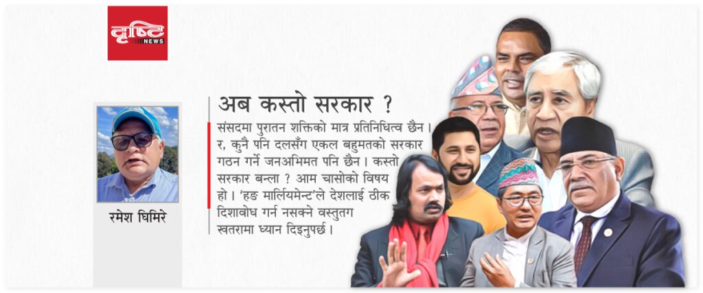 मंसिर ४ मा सम्पन्न निर्वाचनमार्फत कुनै पनि दलले प्रतिनिधिसभामा एकल बहुमतको सरकार बनाउन चाहिने संख्या प्राप्त गर्न सकेनन् । जोड, घटाउ, गुणा र भाग गरेर एकदमै पृथक विचार भएका र अलग दिशातर्फ फर्किएका दलहरू मिलेर सरकार बनाउने कसरत सुरु भइसकेको छ ।