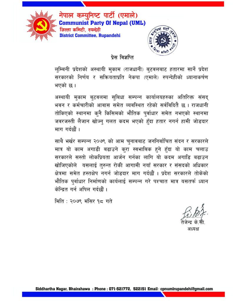 आइतबार एमाले रुपन्देहीले विज्ञप्तिमा जारी गर्दै लुम्बिनी प्रदेशको अस्थायी मुकाम बुटवलबाट हतारमा मन्त्रालयहरु सार्ने प्रदेश सरकारको निर्णय र सक्रियता तत्काल रोक्न माग गरेको छ ।