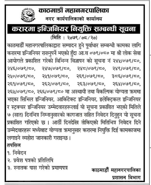 काठमाडौं । काठमाडौं महानगरपालिकाले मातहतका कार्यलयमार्फत सम्पादन हुने पूर्वाधार सम्बन्धी कामका लागि करारमा इन्जिनियर नियुक्त गर्ने भएको छ ।