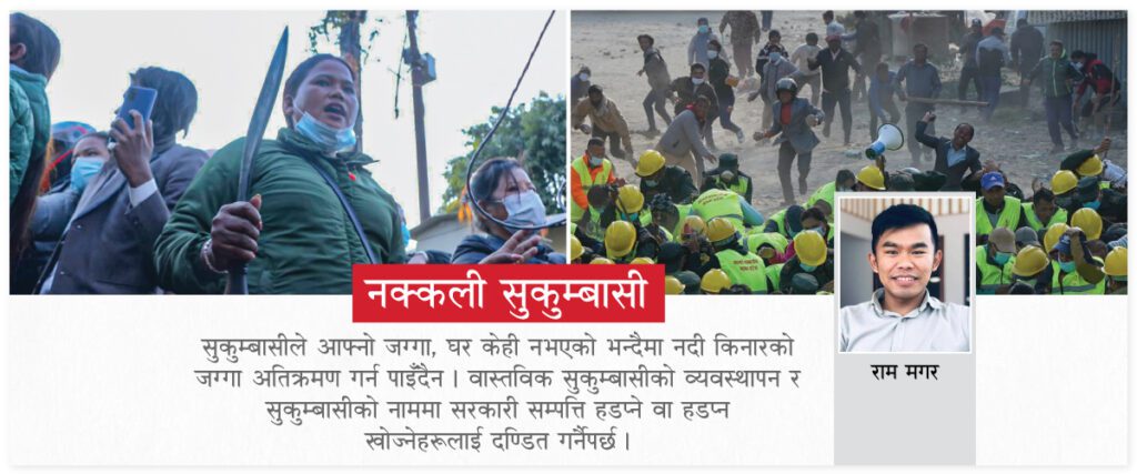 तर, सुकुम्बासीको नाममा सरकारी जग्गा कब्जा गरेर बस्नु कानुन विपरित हो । सरकारले सुकुम्बासीको व्यवस्थापनमा विशेष ध्यान दिनुपर्छ । सुकुम्बासीहरूले नदी किनारकै सार्वजनिक जग्गा अतिक्रमण गर्नु किन ? भन्ने प्रश्न पनि उठ्छ । सुकुम्बासीको लागि सरल, सहज हुनेगरि कुनै स्थानमा व्यवस्थापन गर्नु सरकारको दायित्व हो । तर, सुकुम्बासीले आफ्नो जग्गा, घर केहि नभएको भन्दैमा नदी किनारको जग्गा अतिक्रमण गर्न पाइँदैन ।