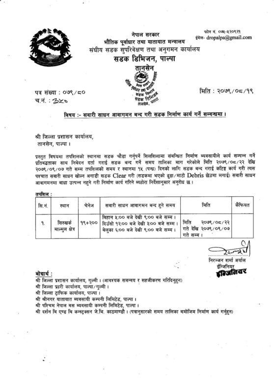 मंसिर २२ गतेदेखि पुस ७ गतेसम्मका लागि दैनिक १० घण्टाका दरले १५ दिनसम्म सडक बन्द गरिएको सडक डिभिजन कार्यालय पाल्पाले जनाएको छ । सडक डिभिजन कार्यालय पाल्पाले एक सूचना जारी गर्दै सडक चौडा गर्नुपर्ने भएकाले बाटो बन्द गरी सडक निर्माण कार्य गरिने जनाएको छ । सडक निर्माणको समय बिहान ५ बजेदेखि ९ बजेसम्म, दिउँसो १२ बजेदेखि ३ बजेसम्म र बेलुका ६ बजेदेखि ९ बजेसम्म सडक बन्द रहने छ ।