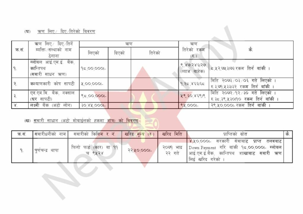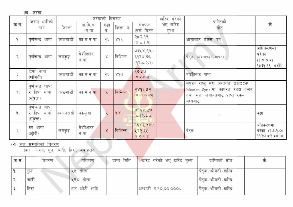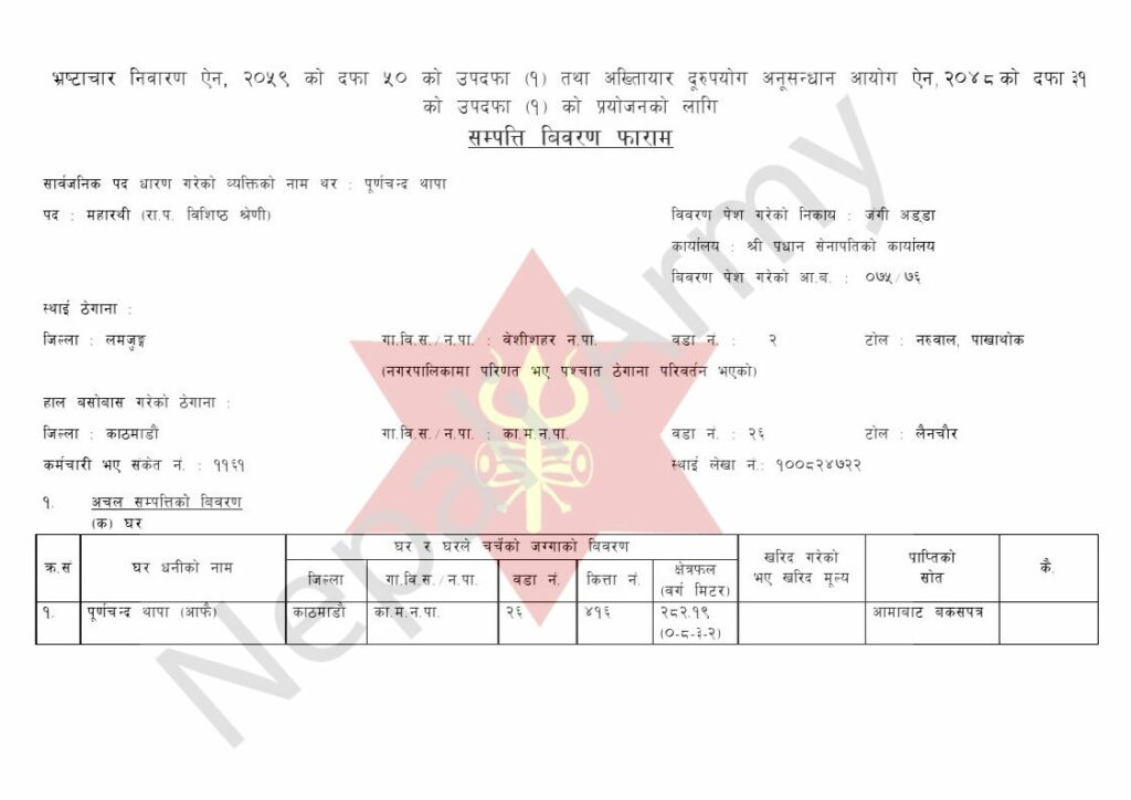 पारदर्शीतामा जोड दिदै प्रधान सेनापति पूर्णचन्द्र थापाले आफ्नो सम्पत्ति विवरण सार्वजनिक गरेका छन् । आफू र आफ्नो परिवारको नाममा रहेको चल–अचल सम्पत्ति उनले मंगलबार सार्वजनिक गरेका हुन् । उनले भ्रष्टाचार निवारण ऐन, २०५९ को दफा ५० को उपदफा (१) तथा अख्तियार दुरुपयोग अनुसन्धान आयोग ऐन, २०४८ को दफा ३१ को उपदफा (१) को प्रयोजनका लागि भन्दै सम्पत्ति विवरण सार्वजनिक गरेका हुन् ।