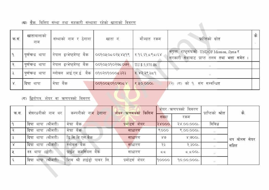 थापाले श्रीमती दिपा थापा र छोरी रुरु थापाको नाममा रहेको सम्पत्ति पनि सार्वजनिक गरेका छन् । थापासँग ५५ तोला सुन, ५९० तोला चाँदी र करिब १० लाख रुपैयाँमा खरिद गरेको हिराको हार र औंठी रहेको विवरण सार्वजनिक गरेका छन् ।