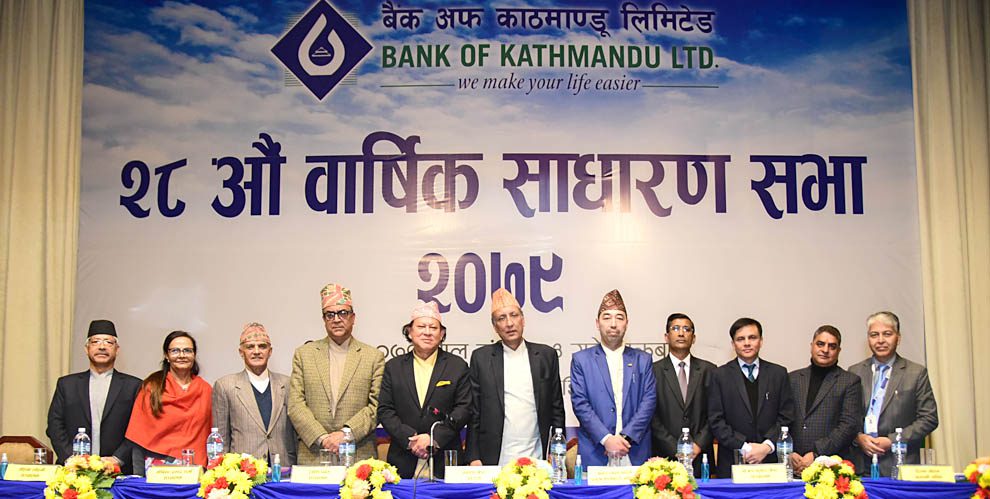 काठमाडैं । बैंक अफ काठमाण्डूको २८औँ वार्षिक साधारणसभा २०७९ मंसिर २३ गते शुक्रबार त्रिभुवन आर्मी अफिसर्स क्लब टुडिखेल काठमाडौंमा बैंकका सञ्चालक समितिका अध्यक्ष प्रकाश श्रेष्ठको अध्यक्षतामा सम्पन्न भयो । साधारणसभाले समितिको प्रतिवेदन पारित गरेको छ ।