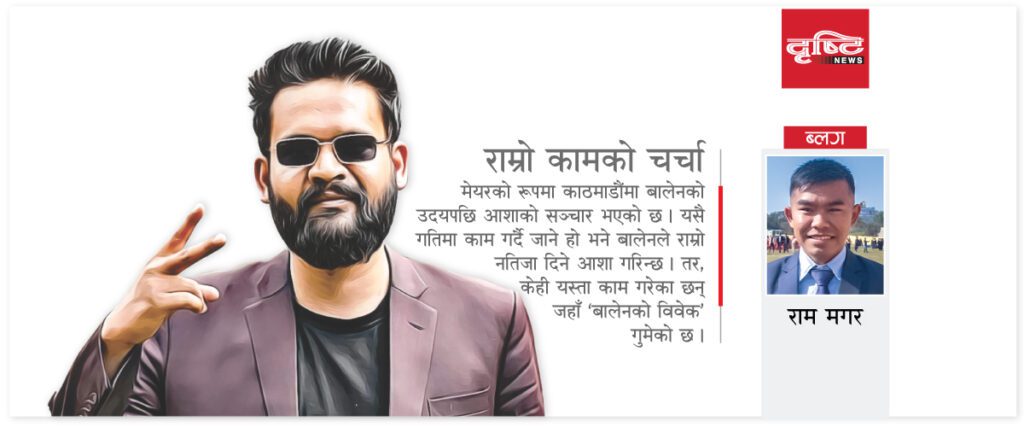 मेयरको रुपमा काठमाडौंमा बालेनको उदयपछि आशाको सञ्चार भएको छ । यसै गतिमा काम गर्दै जाने हो भने बालेनले राम्रो नतिजना दिने आशा गरिन्छ । तर, केही यस्ता काम गरेका छन् जहाँ ‘बालेनको विवेक’ गुमेको छ ।