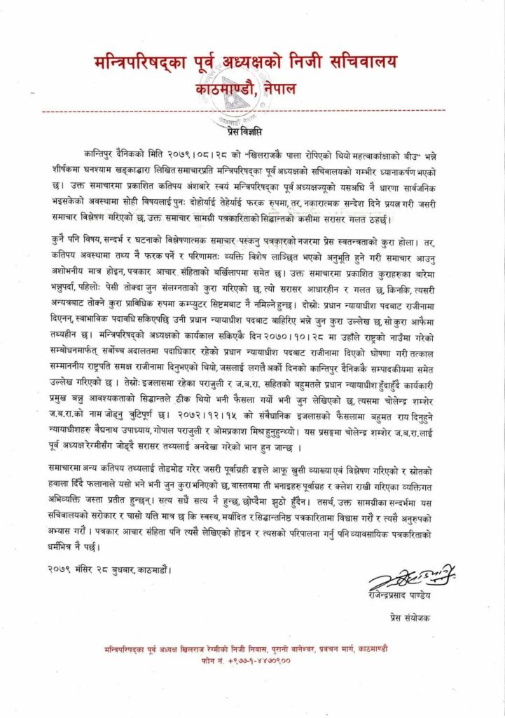 रेग्मीको सचिवालयले जारी गरेको विज्ञप्ति–