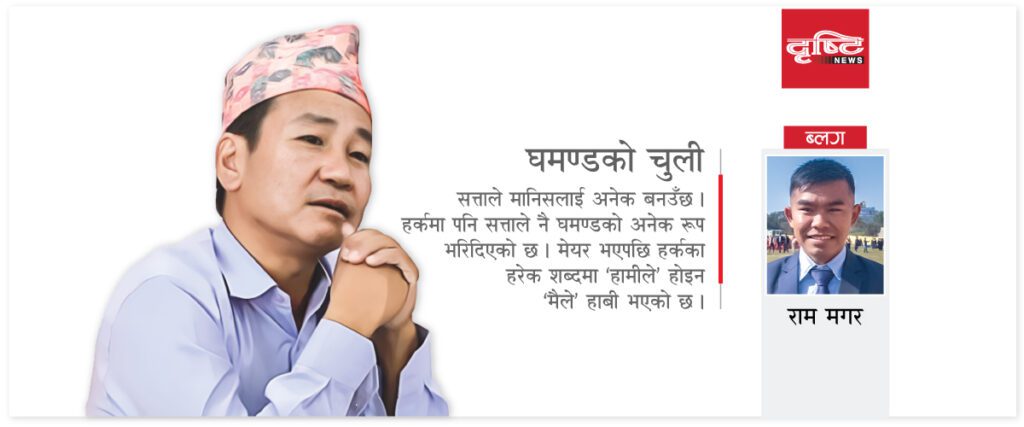 सत्ताले मानिसलाई अनेक बनउँछ । हर्कमा पनि सत्ताले नै घमण्डको अनेक रूप भरिदिएको छ । मेयर भएपछि हर्कका हरेक शब्दमा ‘हामीले’ होइन ‘मैले’ हाबी भएको छ ।