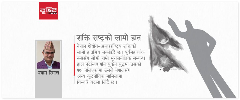 नेपाल क्षेत्रीय–अन्तरर्राष्ट्रिय शक्तिको लामो हातभित्र जकडिँदै छ । पूर्वमहाशक्ति रुससँग सोझै हाम्रो भूराजनीतिक सम्बन्ध हाल नदेखिए पनि युक्रेन युद्धमा उसको पक्ष नलिएकामा उसले नेपालसँग अन्य कूटनीतिक मामिलामा विस्तारै बदला लिँदै छ ।