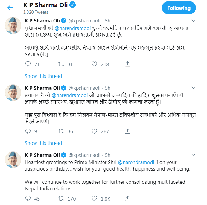 नेपालका प्रधानमन्त्री केपी शर्मा ओलीले समेत उनलाई शुभकामना दिएका छन् । सामाजिक सञ्जाल ट्विटरमार्फत ओलीले तीन भाषामा शुभकामना दिएका छन् । नेपाली, अंग्रेजी र गुजराती भाषामा उनले शुभकामना दिएका हुन् ।