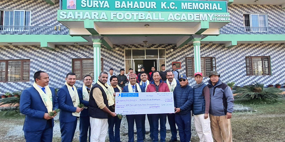 काठमाडौं । लुम्बिनी विकास बैंकले संस्थागत सामाजिक उत्तरदायित्व कार्यक्रमअन्तर्गत सहारा एकेडेमी पोखराद्वारा पोखरा–१७ दोबिल्लामा सञ्चालित सहारा फुटबल एकेडेमीलाई विगतमा गरिरहेको सहयोगलाई निरन्तरता दिँदै आर्थिक सहयोग स्वरुप रु २ लाख ४३ हजार सहयोग हस्तान्तरण गरेको छ ।