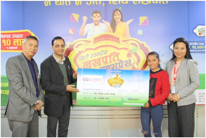 हालै गरिएको उपहार घोषणाअन्तर्गत जापानबाट पैसा पठाइ पहिलो (असोज) महिनाको रु एक लाखको मासिक लक्की ड्र«मा परी बाग्लुङ निवासी हाल जापानमा कार्यरत गोबिन्दबहादुर थापा विजेता घोषित भएका छन् । सिटी एक्सप्रेस कम्प्लेक्स भवनमा कार्यक्रमको आयोजना गरी उक्त नगद पुरस्कार कम्पनीमा आयोजित समारोहबीच थापाकी छोरी सिर्जना थापालाई हस्तान्तरण गरिएको छ ।