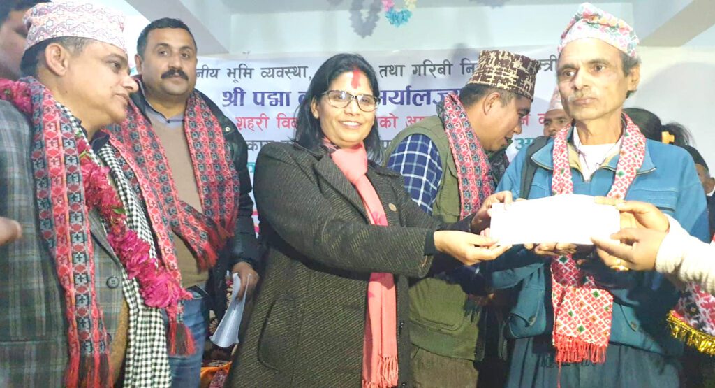 स्याङ्जा, २१ पुस । भूमि व्यवस्था, सहकारी तथा गरिबी निवारणमन्त्री पद्माकुमारी अर्यालले सुरक्षित जनता आवास निर्माणका लागि सरकार देशभरका खरका छाना विस्थापित गर्ने अभियानमा लागेको बताउनुभएको छ ।