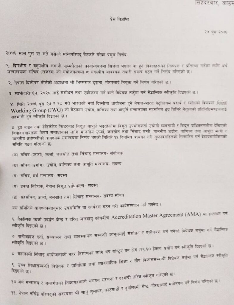 २१ पुसमा बसेको मन्त्रिपरिषद्का निर्णयहरु सार्वजनिक भएका छन् । सञ्चार तथा सूचना प्रविधि मन्त्री गोकुल बाँस्कोटाले बिहीबार नियमित पत्रकार सम्मेलन गरी निर्णयहरु सार्वजनिक गरेका हुन् ।