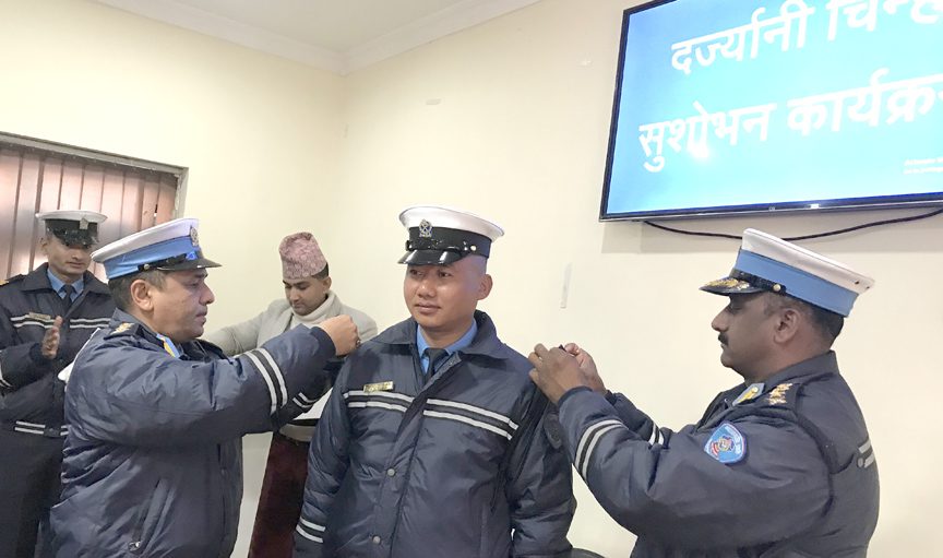 काठमाडौँ, ९ माघ । प्रहरी प्रधान कार्यालय कर्मचारी प्रशासन शाखाको पत्र आदेशले प्रहरी जवान पदबाट प्रहरी हवल्दार पदमा बढुवा हुनु भएका २७ जना प्रहरी हवल्दारहरुलाई आज यस महानगरीय ट्राफिक प्रहरी महाशाखाका प्रमुख प्रहरी वरिष्ठ उपरीक्षक भीम प्रसाद ढकालले एक कार्यक्रमका बीच दर्ज्यानी चिन्हद्वारा शुशोभन गर्नु भएको छ ।