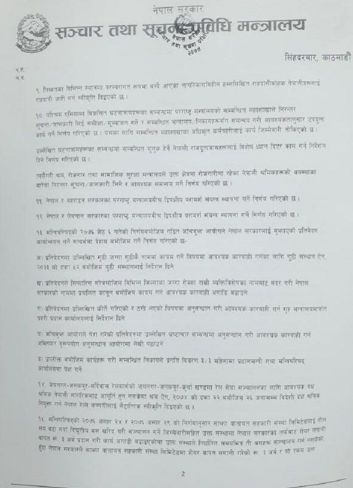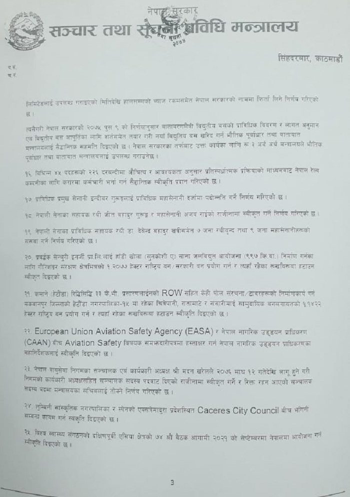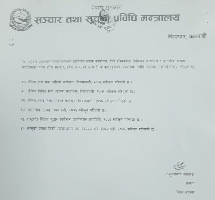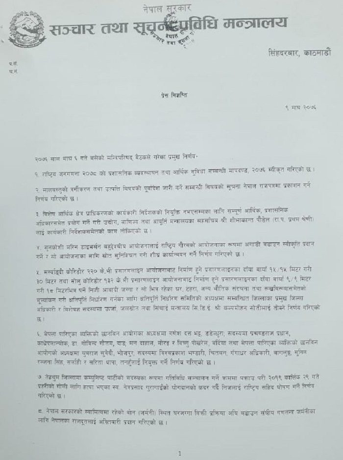 मन्त्रिपरिषद् बैठकले जर्मनीको बोनस्थित सरकारको स्वामित्वमा रहेको घरजग्गा बिक्रीका लागि जर्मनीस्थित नेपाली दूतावासलाई अख्तियारी प्रदान गरेको छ। यस्तै, जयनगर(जनकपुर(बर्दिबास रेलमार्गको जयनगर(जनकपुर(कुर्था खण्डमा रेल सेवा सञ्चालनका लागि आवश्यक दक्ष श्रमिक नेपालीनागरिक आपूर्ति हुन नसेकमा श्रम ऐनअन्तर्गत २६ जना विदेशी दक्ष कर्मचारी नियुक्ति गर्नका लागि स्वीकृत दिएको छ।