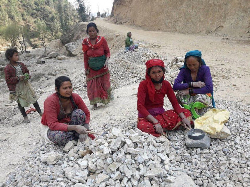 जाजरकोट–जुम्ला सडकखण्डअन्तर्गत खलङ्गा पाँचकाटिया सडकको ग्राभेलको काम अहिले जारी छ । “पढ्दापढ्दै छाडियो, अहिले गिट्टी कुटेर छोराछोरीसहित घरपरिवार चलाउनुपर्छ के गर्नु”, लक्ष्मीले भन्नुभयो । उहाँजस्तै अर्की ४० वर्षीया भीमकुमारी खड्का चार छोराछोरीको पढाइका लागि गिट्टी कुटिरहनुभएको छ । “कुनै राजगारी छैन, यही गिट्टी कुटेर सबै परिवार पाल्नुपर्छ”, उहाँले भन्नुभयो, “छोरीहरु स्थानीय विद्यालयमा कक्षा ५ र ६ मा पढ्छन्, पढाइ खर्चका लागि भए पनि गिट्टीको सहारा लिएको छु, यसमै काम गने ठेकेदारले समयमा पैसा दिँदैनन् ।”