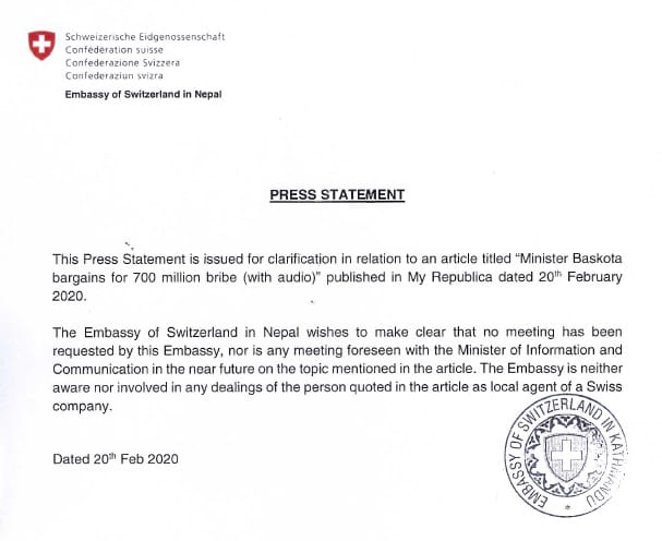 उता स्वीस दूतावासले बिज्ञप्ती जारी गरी मिश्र आफ्नो कम्पनीको प्रतिनिधि नरहेको र यो प्रकरण मन्त्रीसँग समेत आफुहरुले कुनै कुराकानी नगरेको स्पष्ट पारेको छ ।